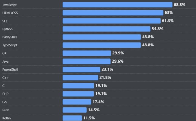 Used by 63% of developers, HTML is a must-know language. It’s the universal code of webpages/apps, often a job requirement for roles and considered a gateway to learning more complex frontend and backend languages. Case in point: it’s currently used on 1.9 billion websites.