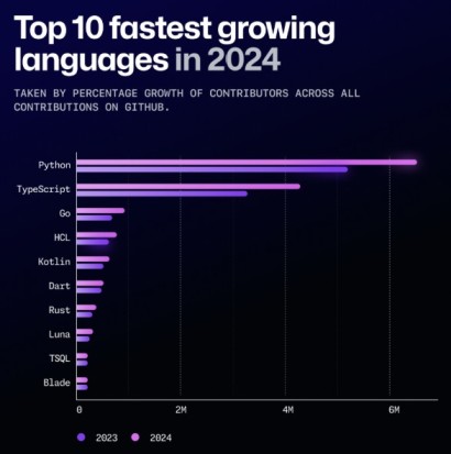 TypeScript has been gaining traction in recent years (up 35% in demand in 2024) as a scalable language for frontend and backend projects. It has a reputation for reliability, code quality and easy maintenance. Plus, it’s listed as the #1 most promising language by JetBrains.
