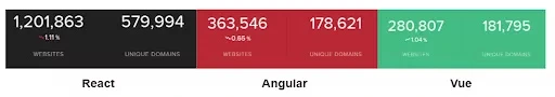 To measure how often web companies use these frameworks, it's also helpful to look at web penetration. Similar Tech has kept a running tab on the number of websites and domains that use these JS frameworks.