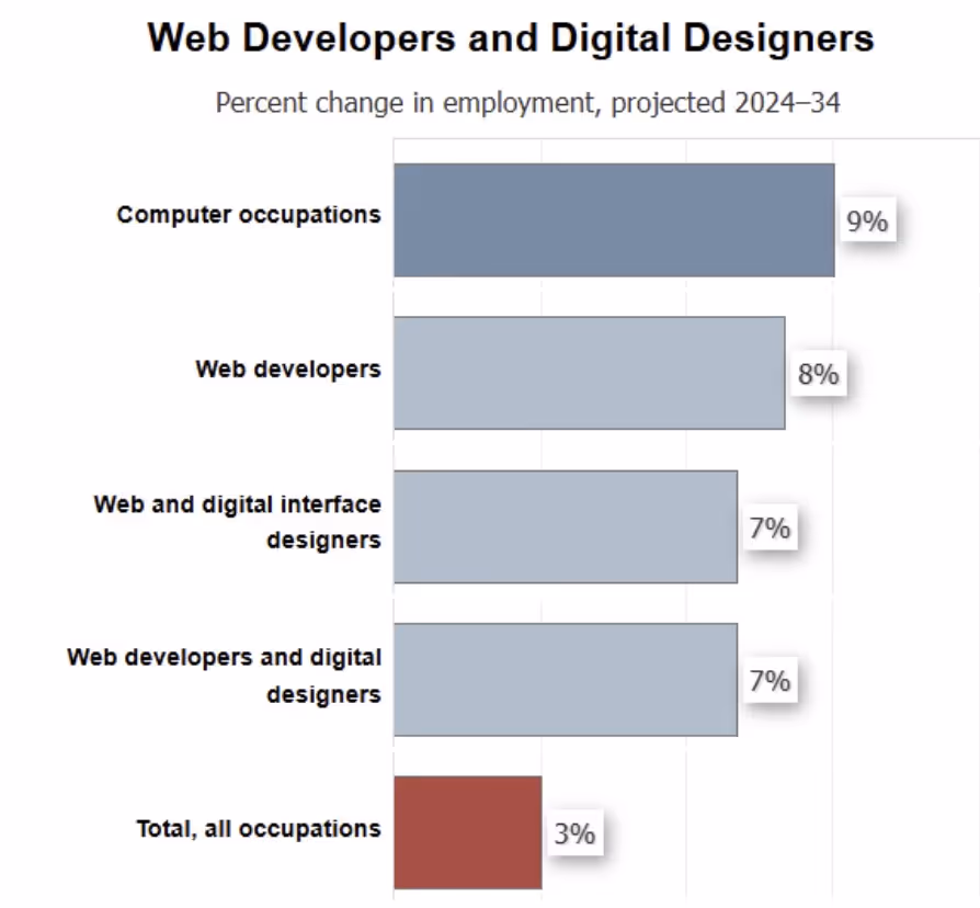The demand for web developers continues to surge in 2025. The U.S. Bureau of Labor estimates 8% growth for web developers, which is considered “much faster than average.”